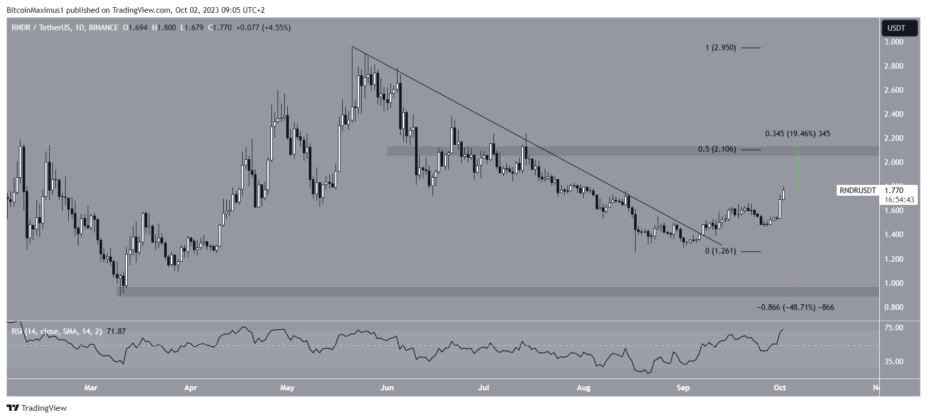 The RNDR price has increased since breaking out from a descending resistance trendline on September 7. The rate of increase accelerated after the price created a higher low on September 27.
