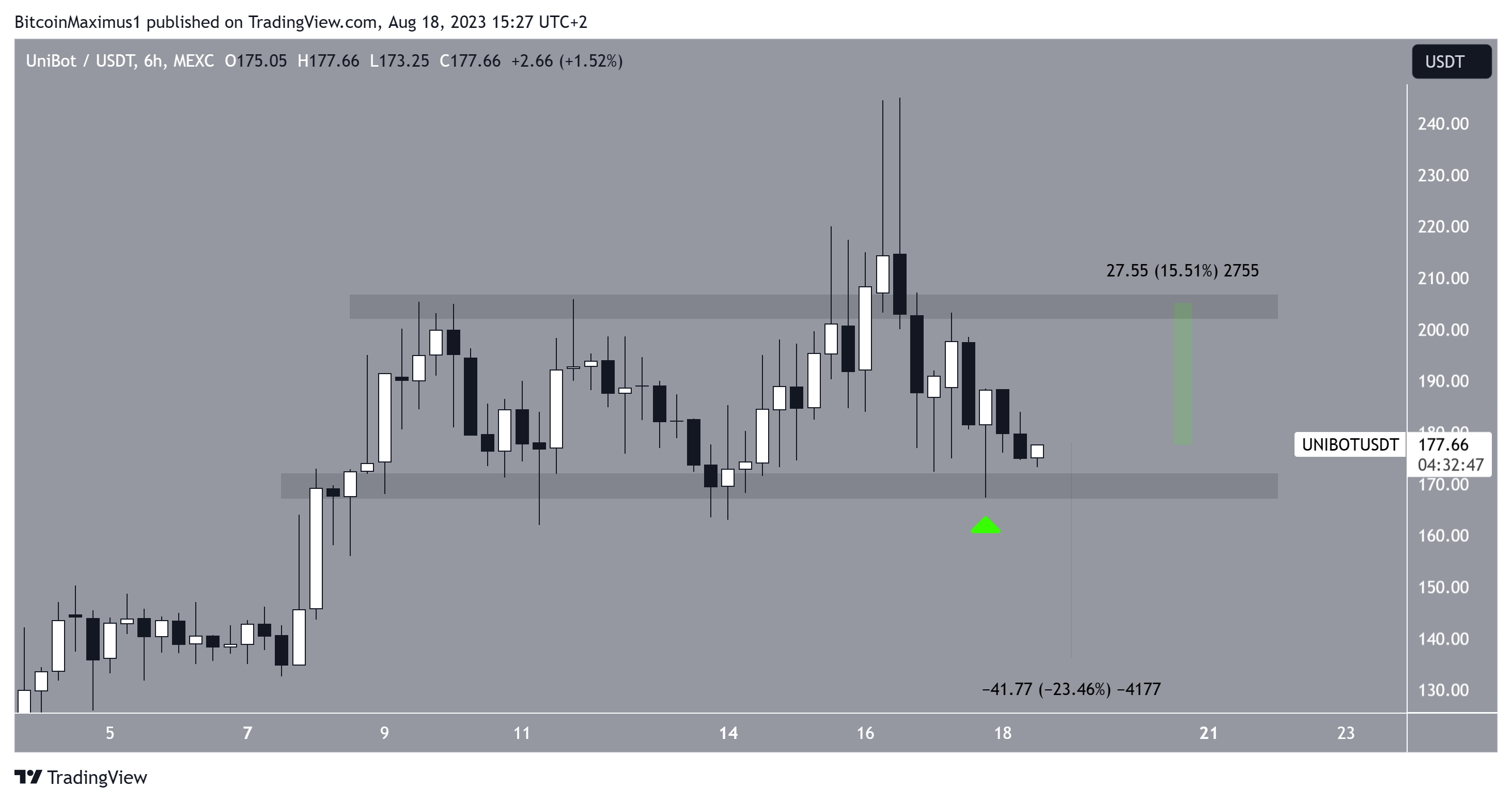 If UNIBOT breaks down, it can fall by 23% to $140. However, it can retest the $205 area if the price bounces. This would be an increase of 15%, measuring from the current price.