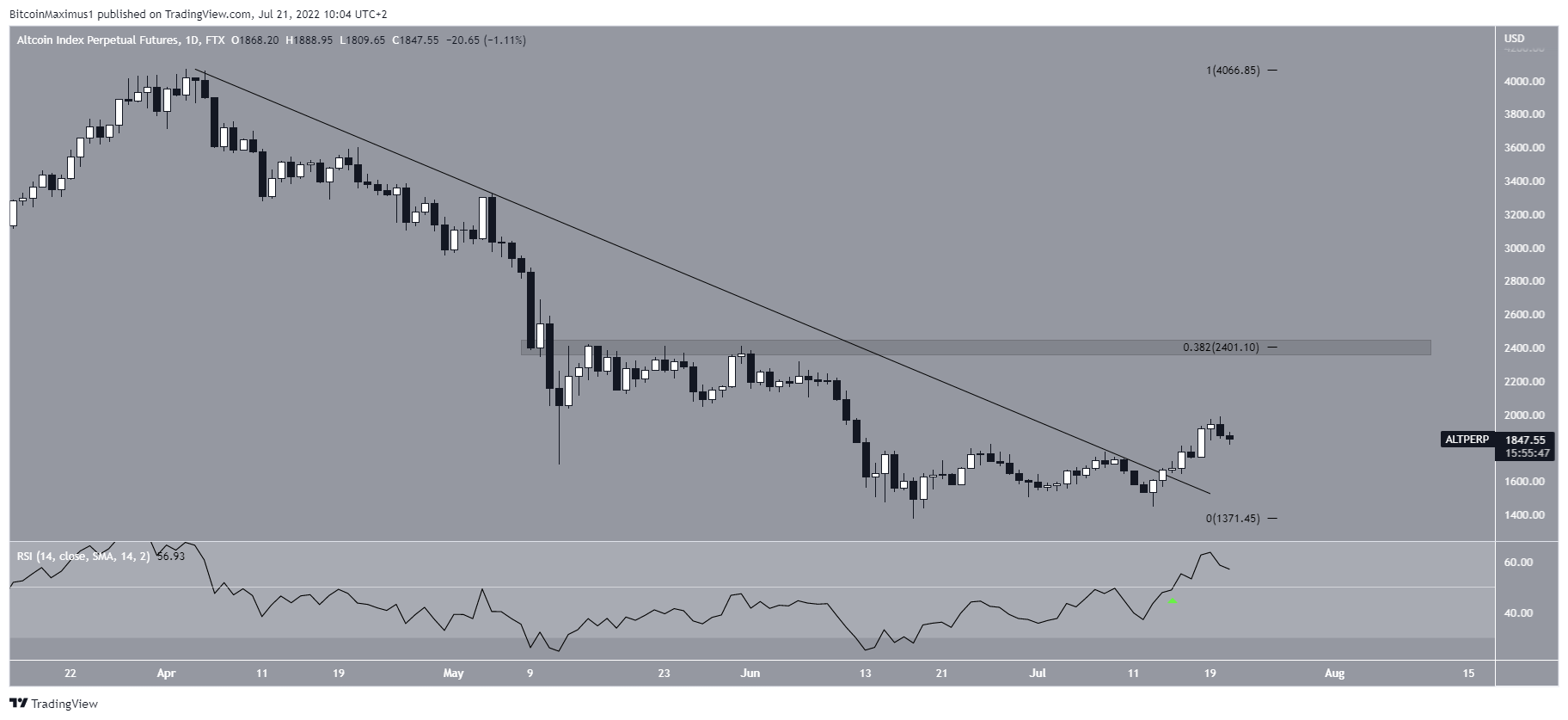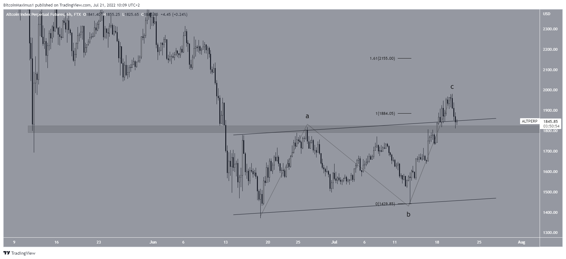 Since the tweet, ALTCAP has broken out from an ascending parallel channel, and could be in the process of validating it as support. The current level is crucial since it coincides with both the resistance line of the channel and the $1,800 support area. So, if the upward movement is to continue, it is crucial that this level gets validated as support.Â