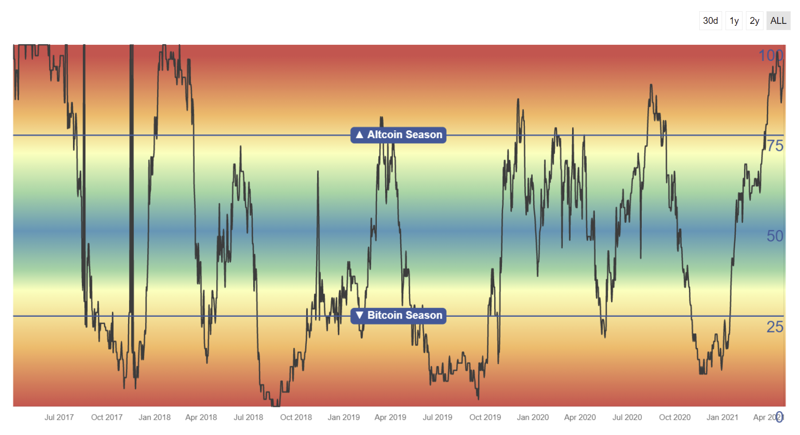 The altcoin season indicator on the Blockchain Center analytics service has been in the red range for several weeks, well above the 75-line. It currently records the value of 96, which was last seen in March 2018.