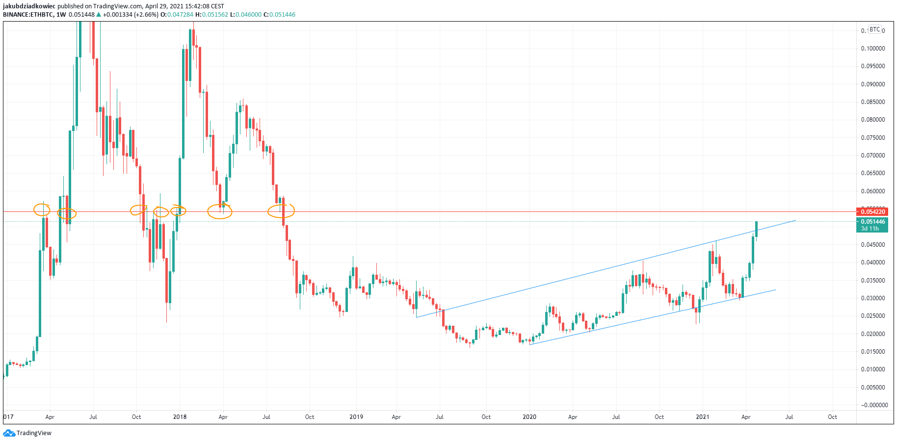 If the growth dynamics are maintained, 0.54 BTC will be another important area of resistance. This level has not been recorded since August 2018, but is historically significant. This is because it’s served as resistance/support many times in the past (orange circles).