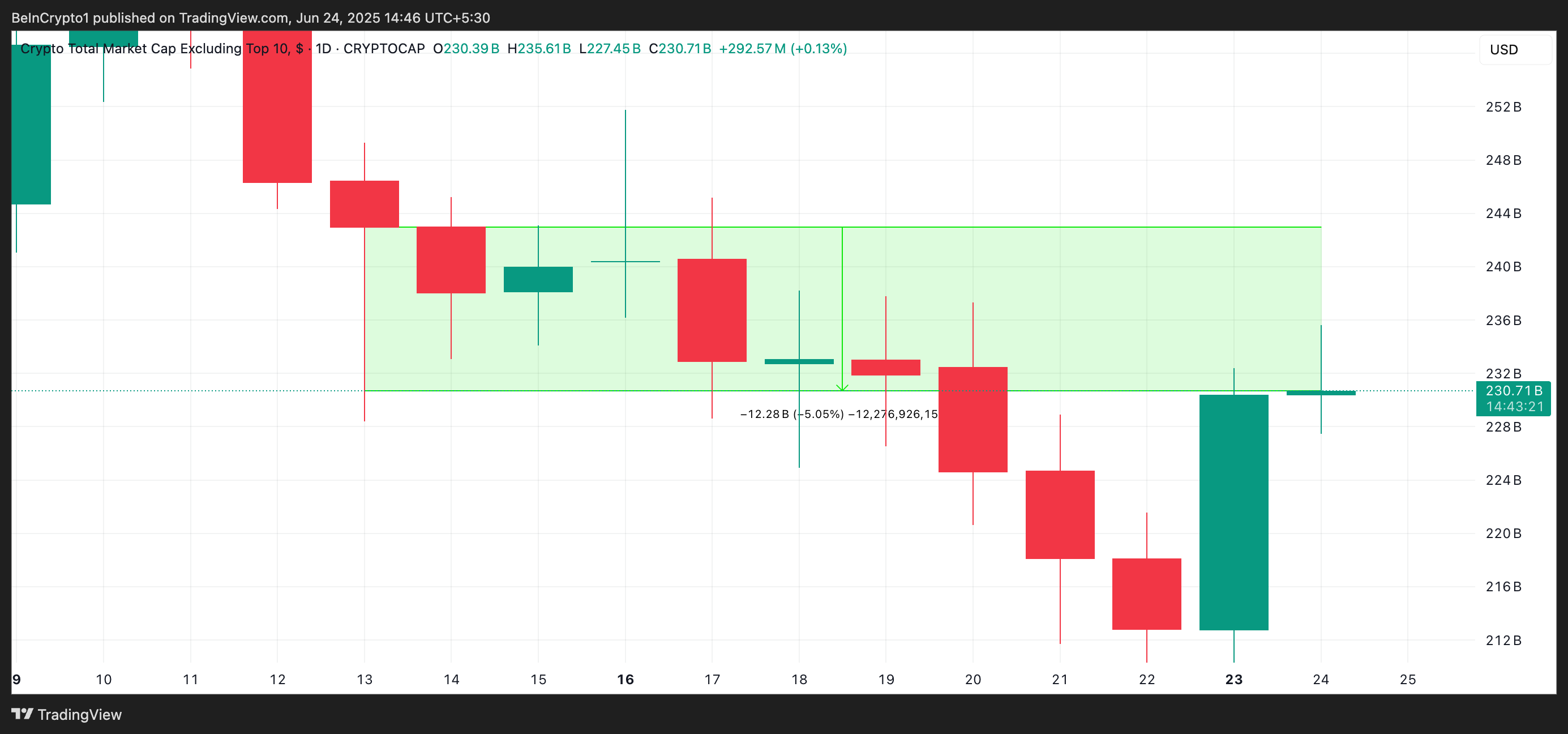 On the other hand, the altcoin market cap, excluding the top 10 coins, has dropped during the same period. OTHERS, which tracks the altcoin market share, has continued to decline, and is currently at $230.08 billion.