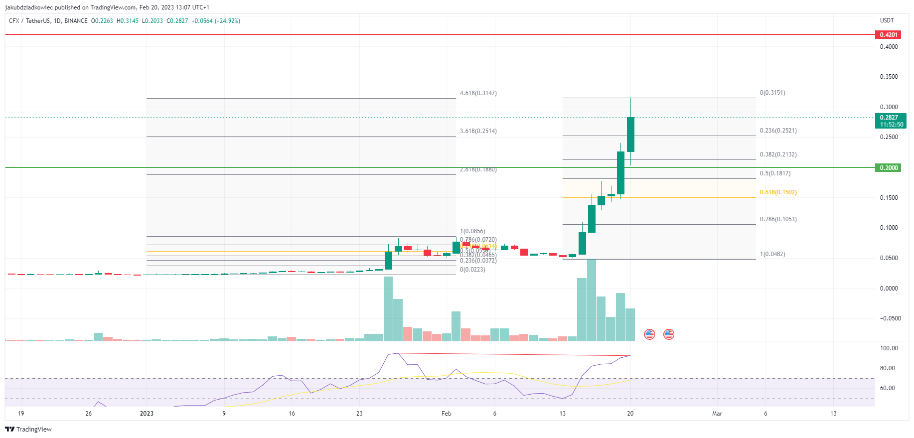 The daily chart of Conflux contains the possibility of a short-term correction. The CFX price today reached the 4.618 Fib external retracement level at $0.315. Usually, this area marks the maximum limit of a short-term upward impulse.