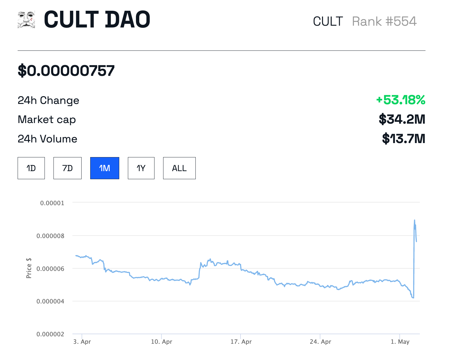 SponsoredThe price rise happened as the community members speculated if Elon Musk was tweeting about Cult DAO. As of writing, CULT is trading at $0.00000757, up more than 53% in 24 hours.