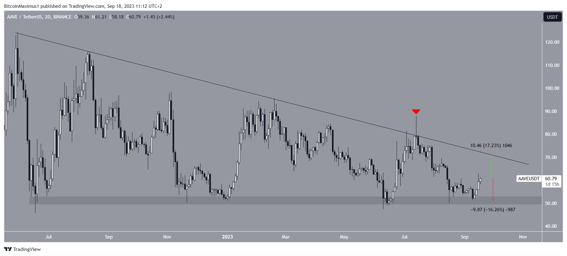 Afterward, the AAVE price fell to the $50 horizontal support area, which has been in place as long as the descending resistance line.