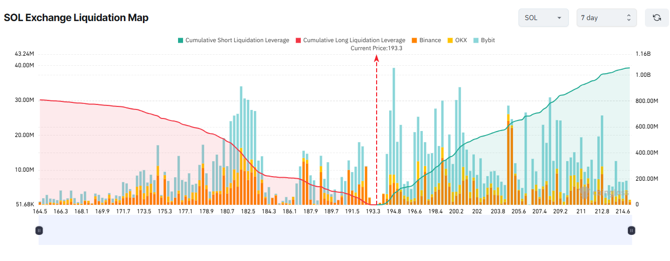 The 7-day liquidation map also reflects a bearish sentiment, with a wide range of short liquidation levels (displayed on the right-side bar chart) stretching from $193 to over $200.