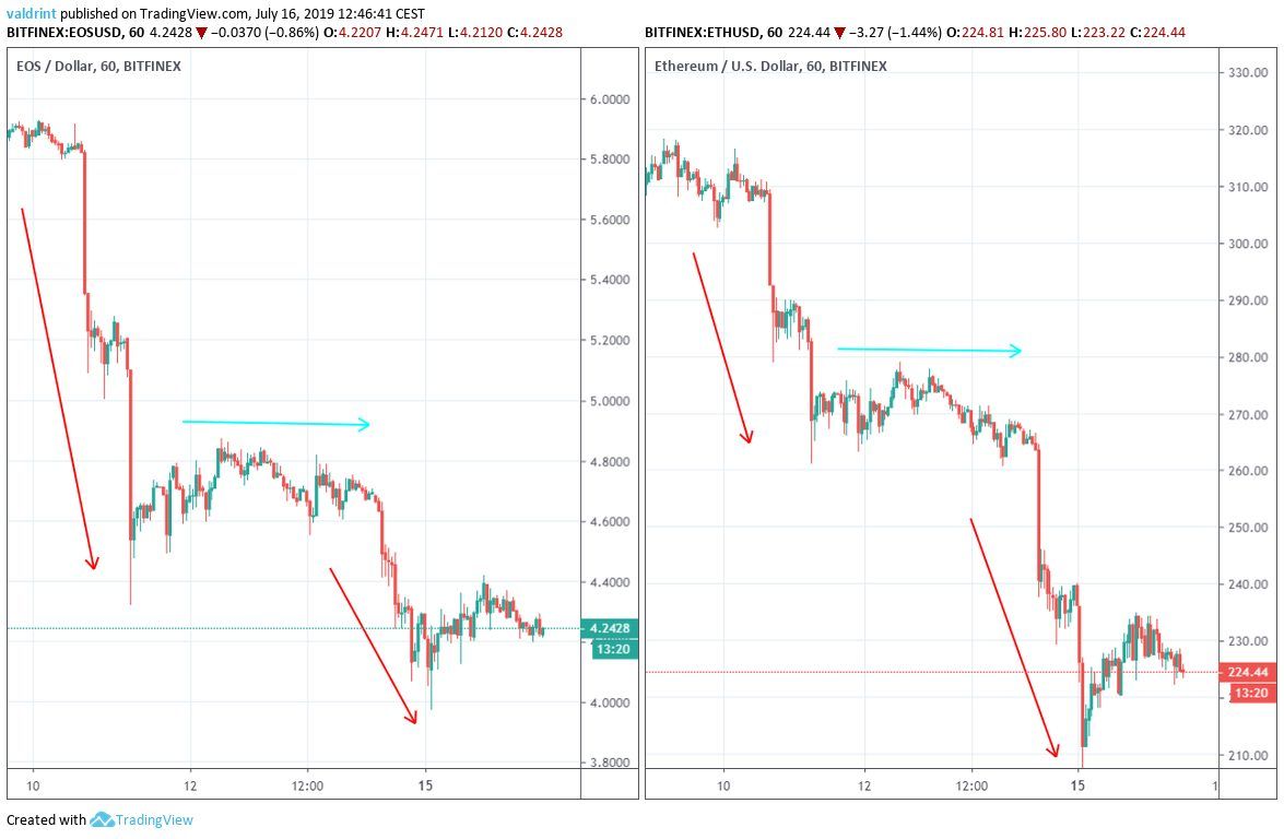 Ethereum and EOS have followed a slightly different pattern throughout their downward moves.