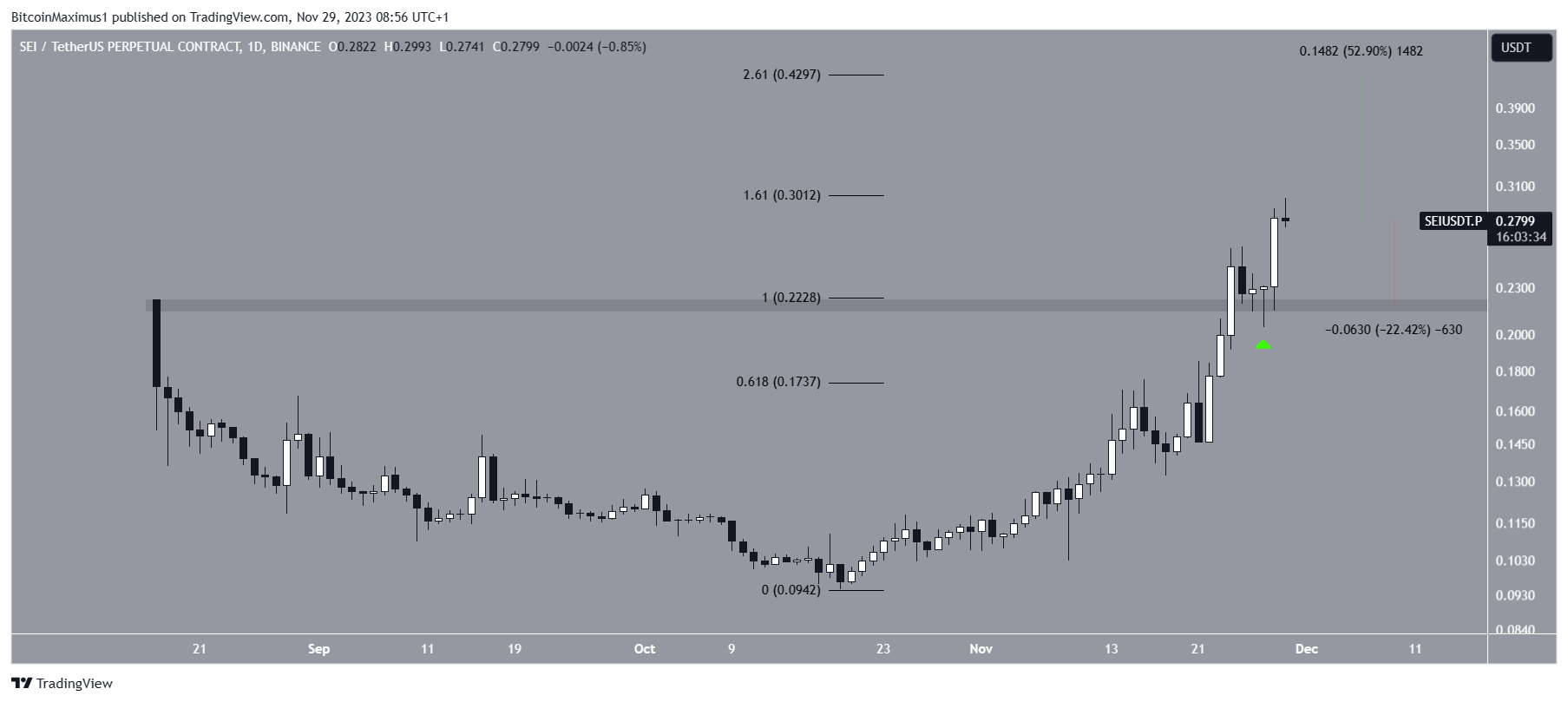 The SEI price has increased swiftly since falling to a low of $0.095 on October 19. The upward movement accelerated on November 22, and the price broke out from a pivotal resistance area two days later.