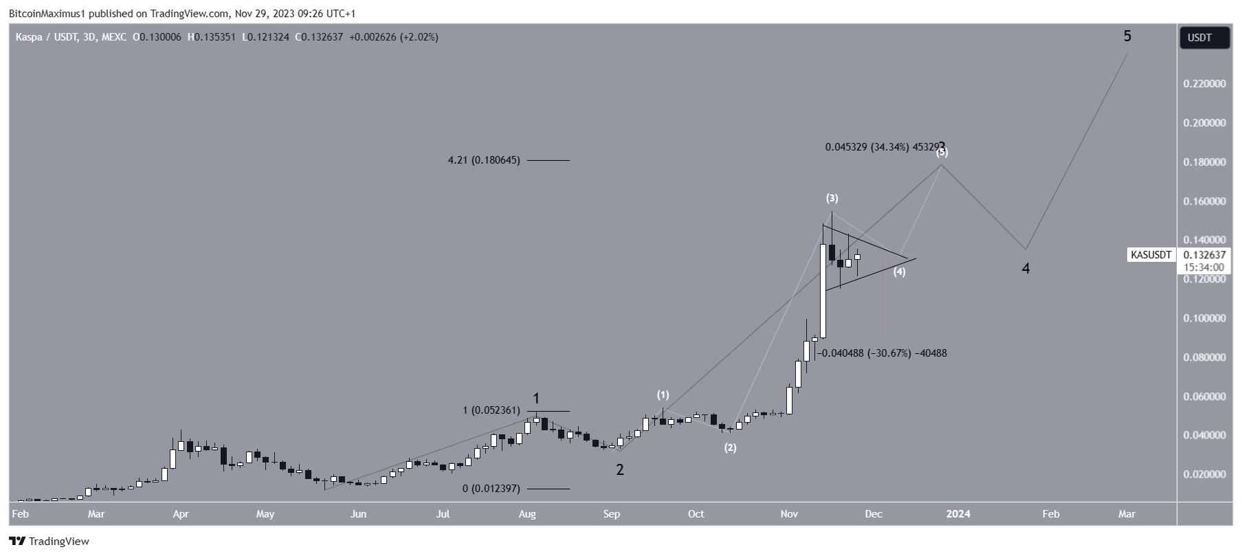 The most likely count suggests that the KAS price is in wave three of a five-wave upward movement that began in May. The sub-wave count is given in white, indicating that KAS is in a corrective wave four, which has taken the shape of a triangle.