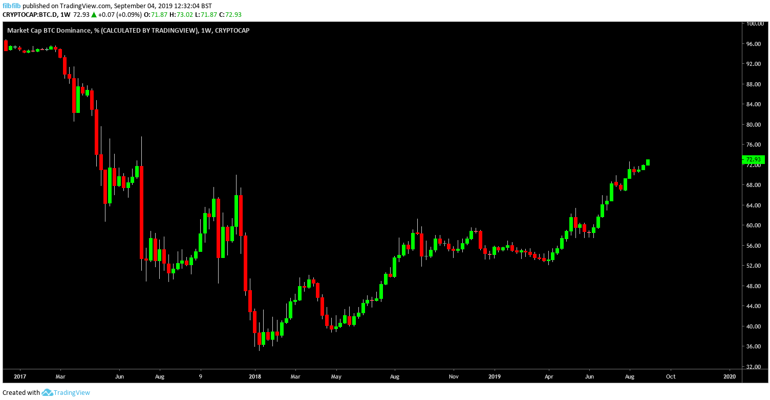 This means that while the USD value of both BTC and other coins has decreased, that of BTC has done so in a much slower rate.