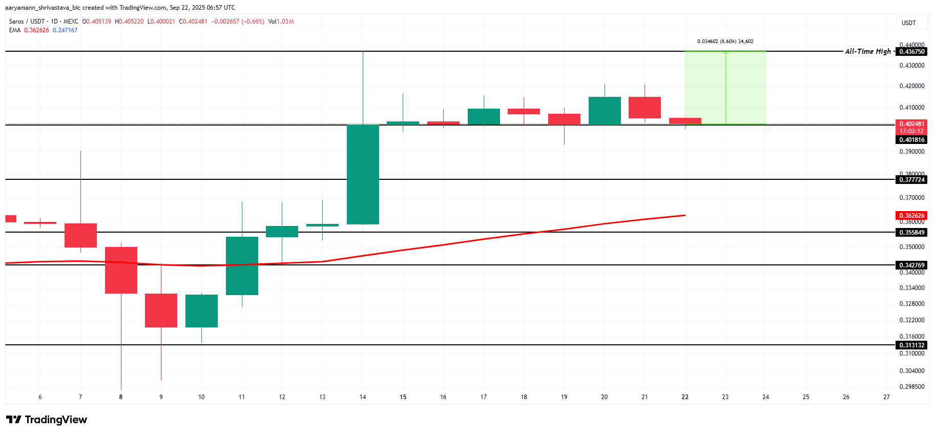 The altcoin is only 8.6% away from its all-time high of $0.436. With the 50-day EMA positioned well below current levels, acting as support, SAROS has technical strength. A bounce off $0.401 could allow the token to retest the ATH this week, boosting investor sentiment further.