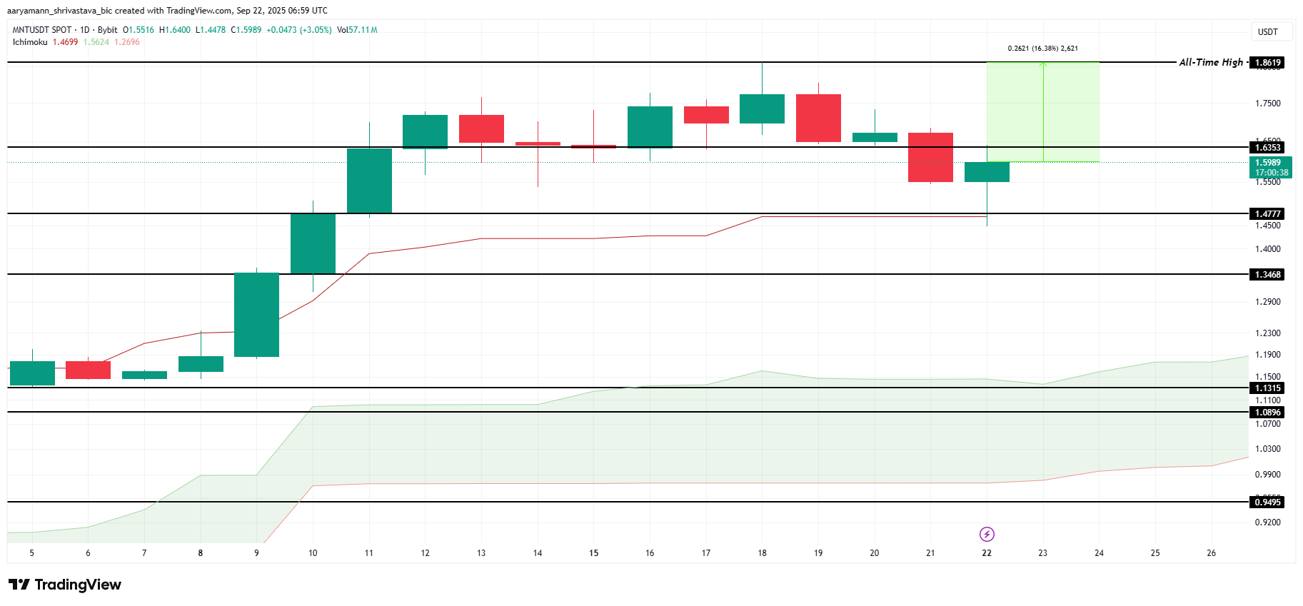 The Ichimoku Cloud indicator suggests bullish momentum is building for MNT. If the altcoin successfully flips $1.63 into support, it could rally toward $1.86. A breakout above this level would retest the ATH and also open the door for new record highs.