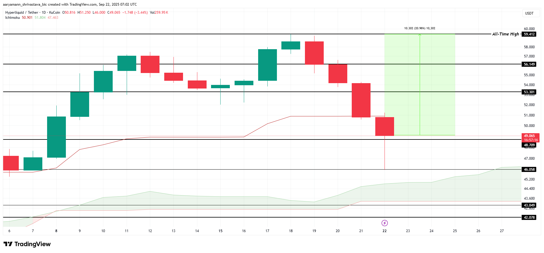 The Ichimoku Cloud indicator suggests bullish momentum remains intact despite recent declines. If HYPE manages to breach $53 and flip it into support, the token could rally toward $56. Clearing this resistance zone would pave the way for a potential retest of the $59 all-time high.