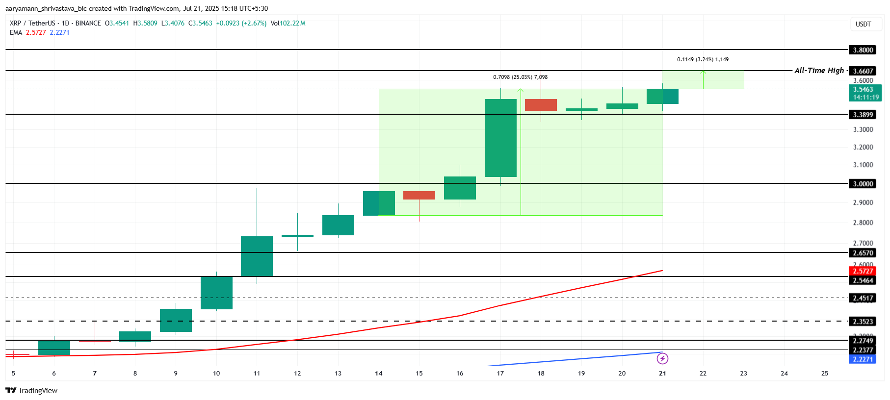 The exponential moving averages show a bullish Golden Cross and are currently serving as dynamic support. This technical signal suggests that XRP is primed for continued gains. A breakout past the $3.66 level could propel the altcoin toward $3.80, enabling it to set a fresh all-time high.