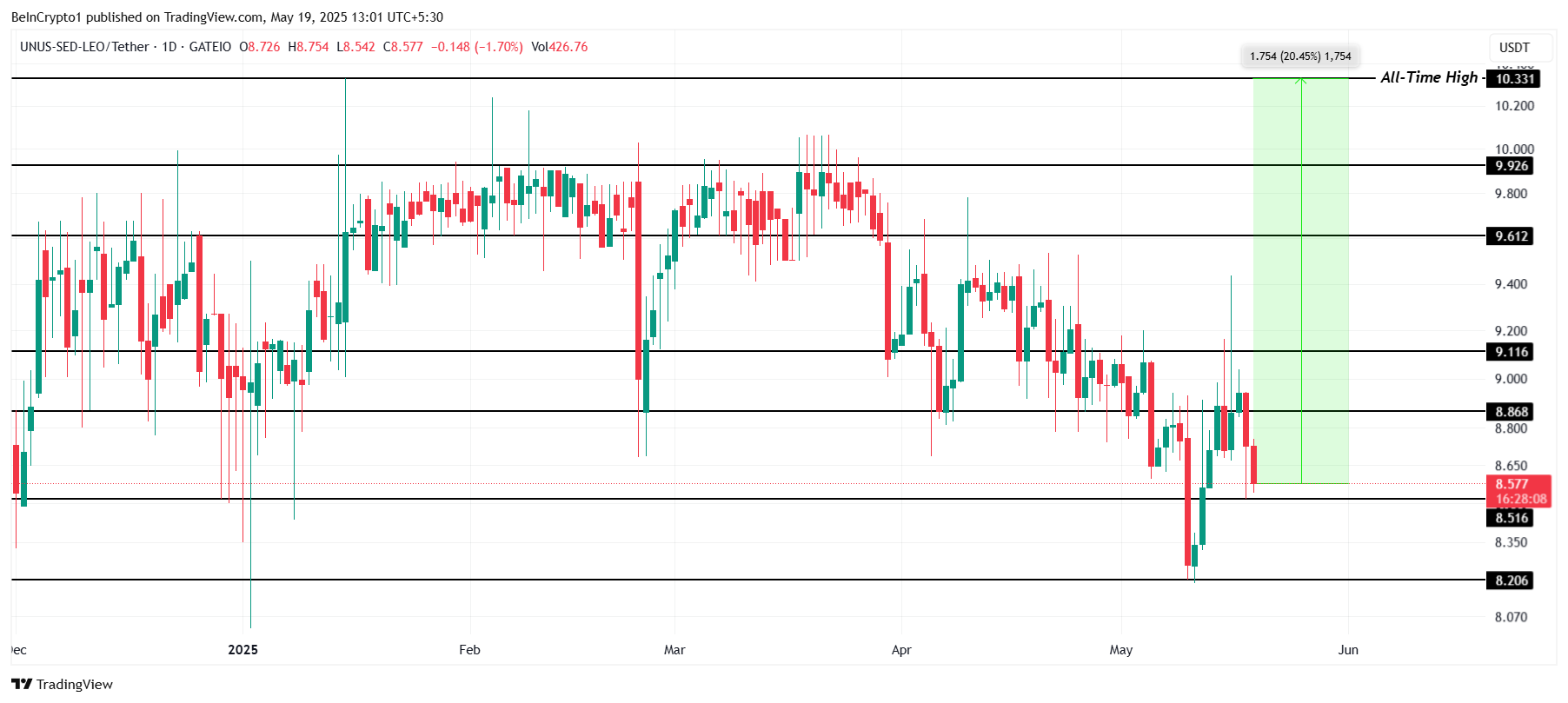 Conversely, if LEO breaks below the $8.51 support level, it may decline further to $8.20. This drop would invalidate the bullish outlook and likely trigger additional selling pressure.