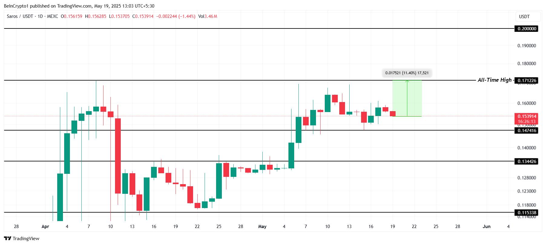 SAROS’s price reached its all-time high of $0.171 in April. It currently trades at $0.153, holding above $0.147 in support. The altcoin remains just 11.4% shy of its peak, signaling potential for growth if positive market conditions continue to influence price action.