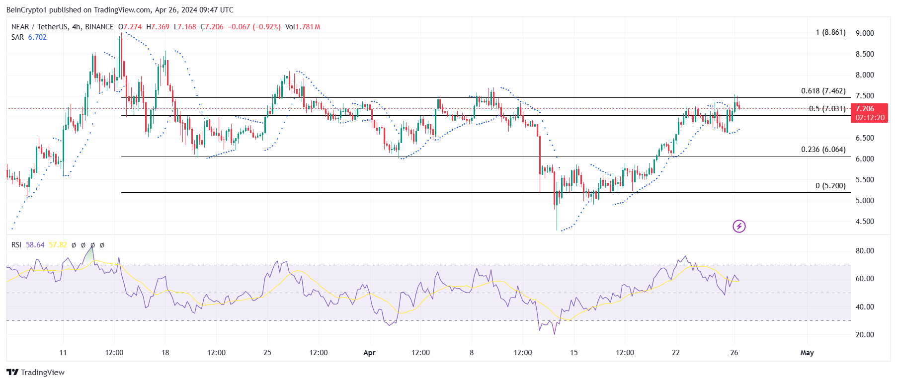 The altcoin is inches from the 61.8% Fibonacci Retracement of $8.8 to $5.2. Marked at $7.4, this level is known as the bull market support floor. Reclaiming it would allow NEAR price to bounce and breach the $8.8 barrier, effectively posting a new 2024 high.