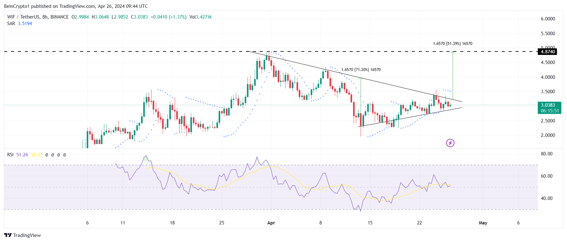 At the time of writing, the meme coin can be seen moving within an isosceles triangle pattern. Per this pattern, a breakout in WIF price is expected, which could potentially send the meme coin to $4.8. This would mark a 51% increase for dogwifhat bolstering its dominance.