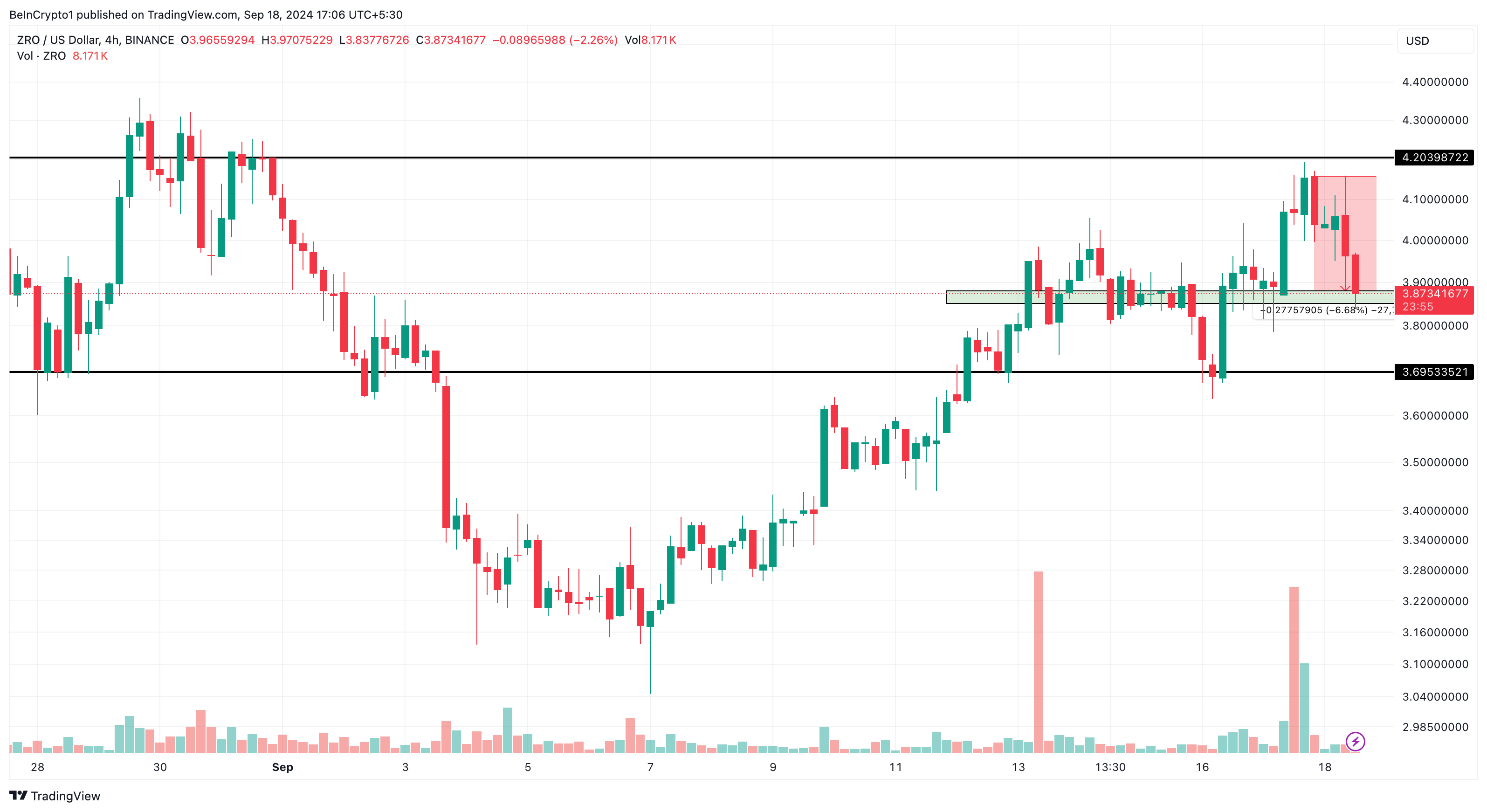 BeInCrypto also agrees with the sentiment, as no token unlock will reduce the supply shock ZRO might face. On the 4-hour chart, ZRO’s price has fallen from $4.16 to $3.87. However, the $3.87 level is historically a major support zone for the token.