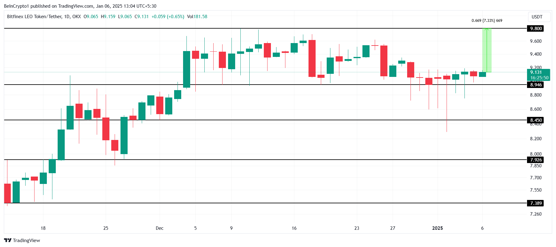 LEO is among the few tokens that have not achieved a new high in the past three weeks despite the recovering market. Its current all-time high (ATH) stands at $9.80, reflecting the token’s potential for a significant breakout in the near term.