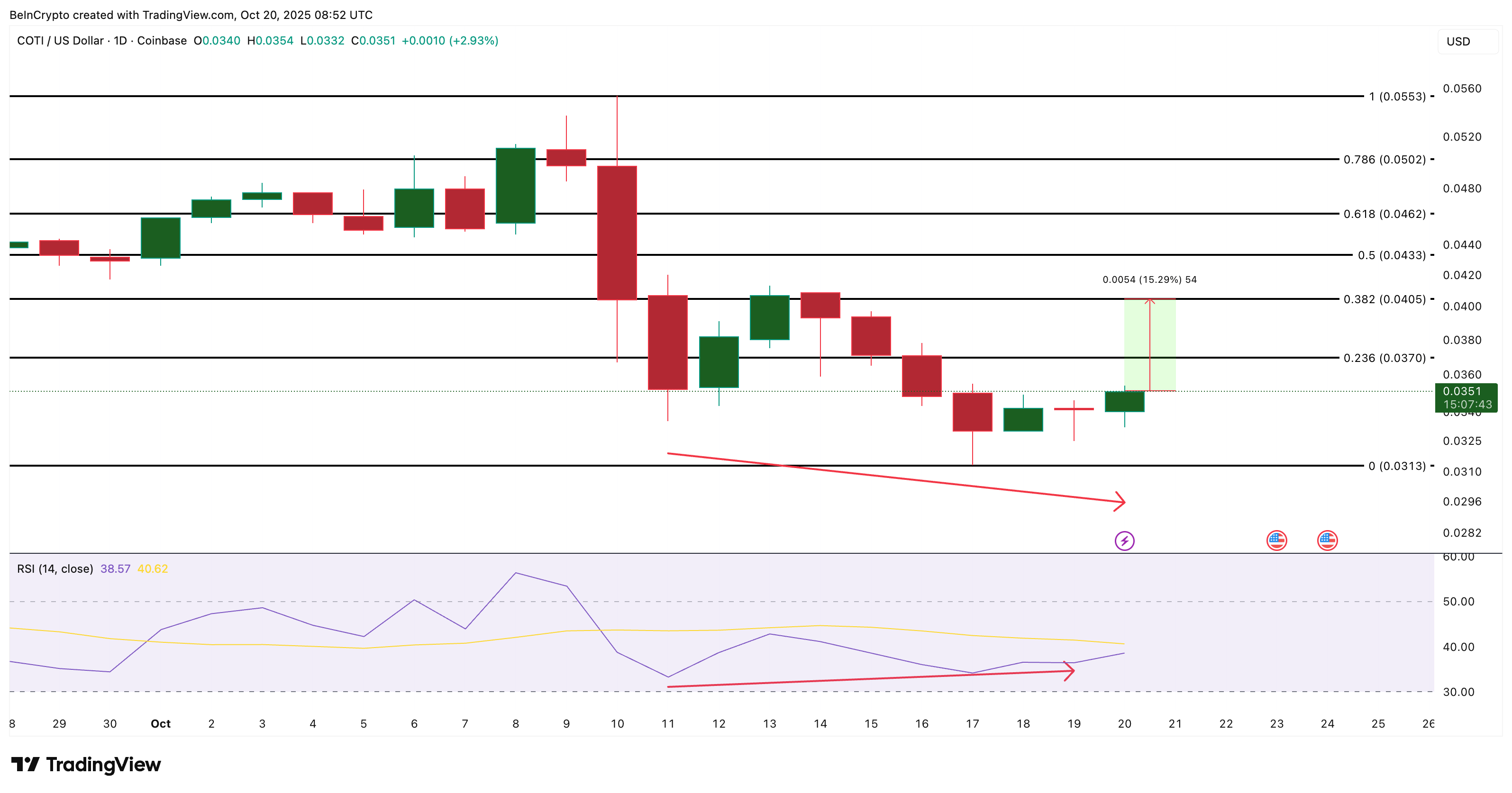 The first key breakout level is at $0.040 — about 15% above current prices. A move above that could send COTI toward $0.055, its next key resistance zone.