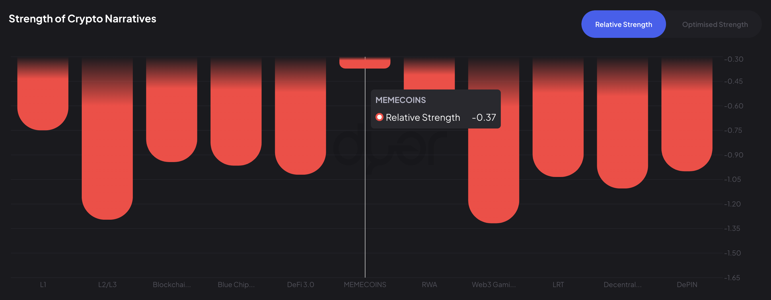 Furthermore, data from the crypto analysis platform DYOR highlights the outperformance of meme coins over the last 90 days during market volatility. With a relative strength of -0.37, meme coins have shown remarkable resilience compared to sectors like Web3 gaming and Layer-2/Layer-3 technologies, which recorded much lower strengths of -1.32 and -1.30, respectively.