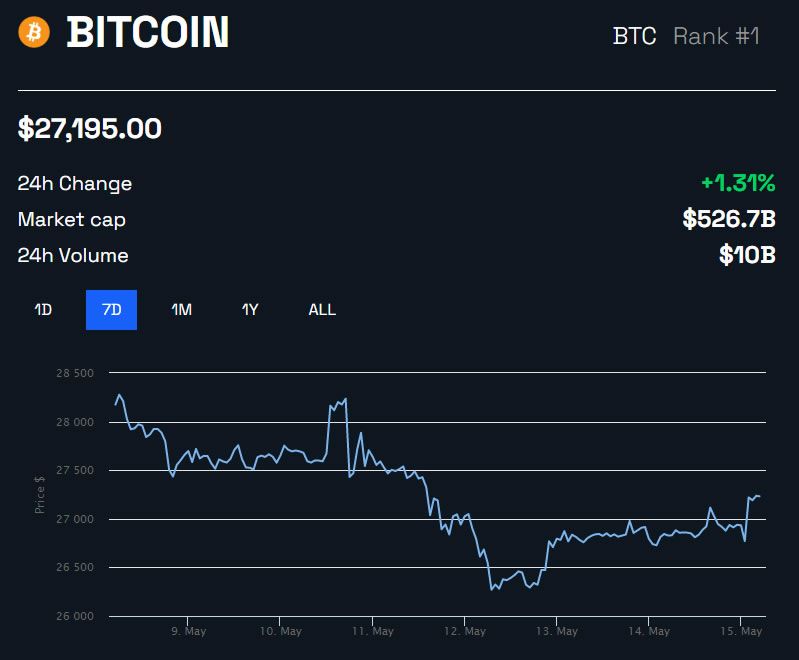 Bitcoin prices were trading up 1.3% on the day at the time of writing. As a result, the asset was changing hands for $27,195 during the Monday morning Asian trading session.