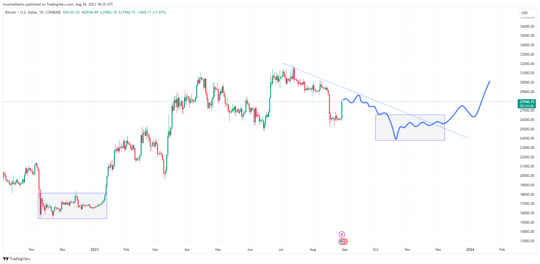 Another pullback has been predicted, followed by a couple of months consolidating around the $25,000 to $26,000 area to see out the year.