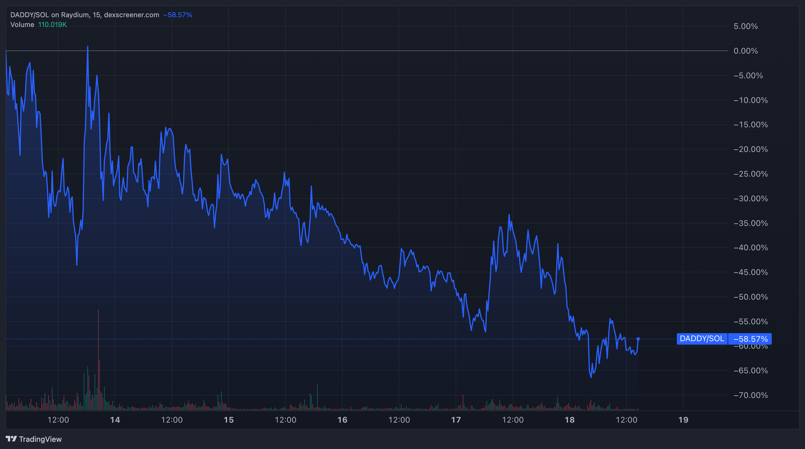 Despite these initiatives, the DADDY meme coin struggles in a volatile market. The coin has plummeted nearly 60% from its peak on June 12.