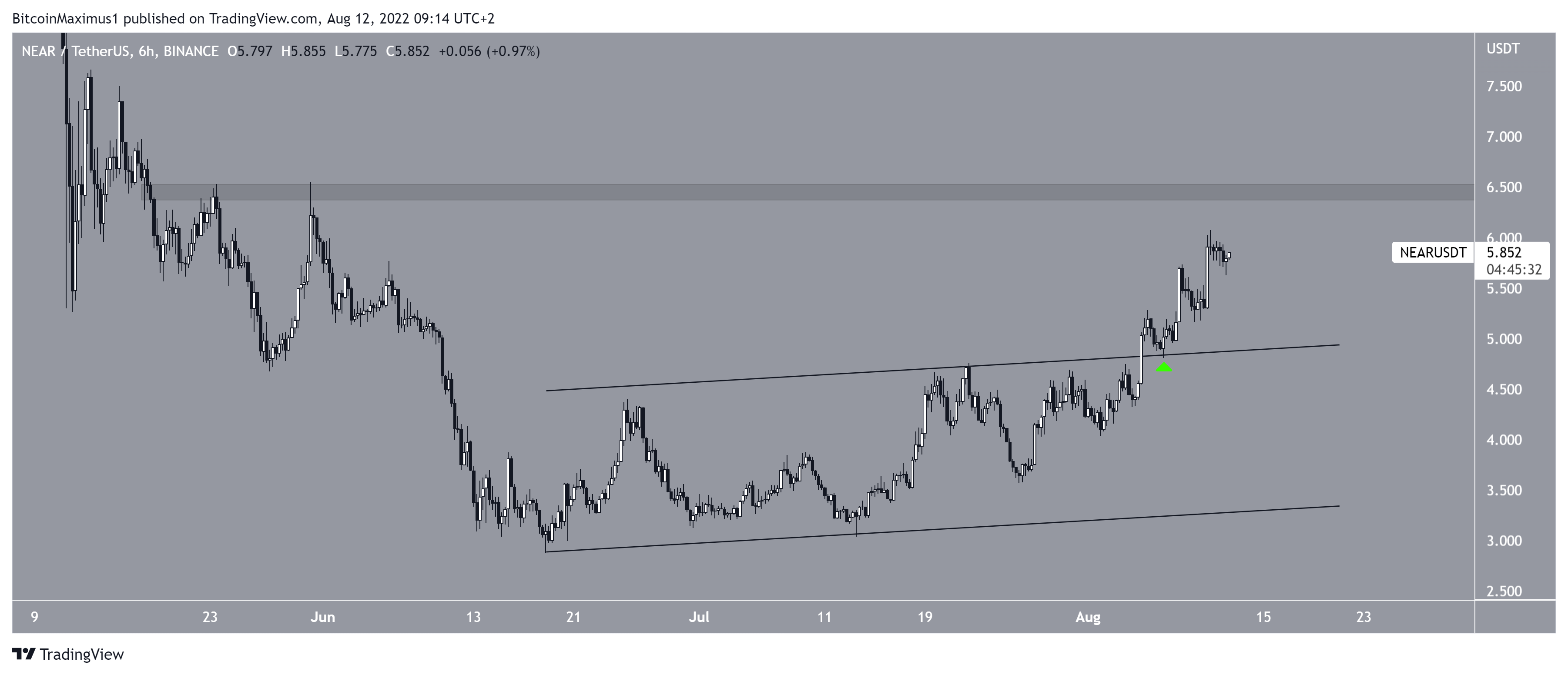 NEAR had been increasing inside an ascending parallel channel since June 18. It broke out from it on Aug 5 and returned to validate it as support two days later (green icon). Since then, NEAR has been increasing at an accelerated rate.