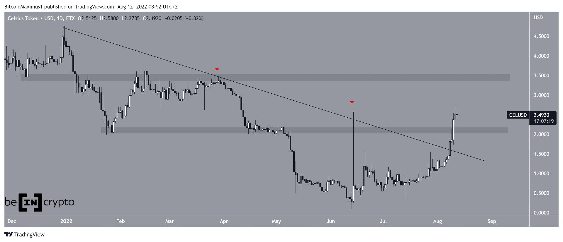 The price has been increasing since and managed to break out from its descending resistance line on the third try (red icons). The breakout occurred on Aug 8. Moreover, CEL reclaimed the $2.10 horizontal area.