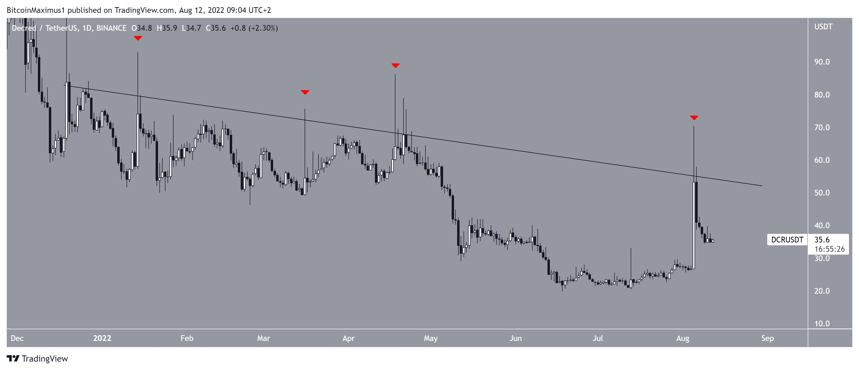 Similarly to ANKR, DCR had been following a descending resistance line. So far, it has made four attempts at breaking out (red icons).