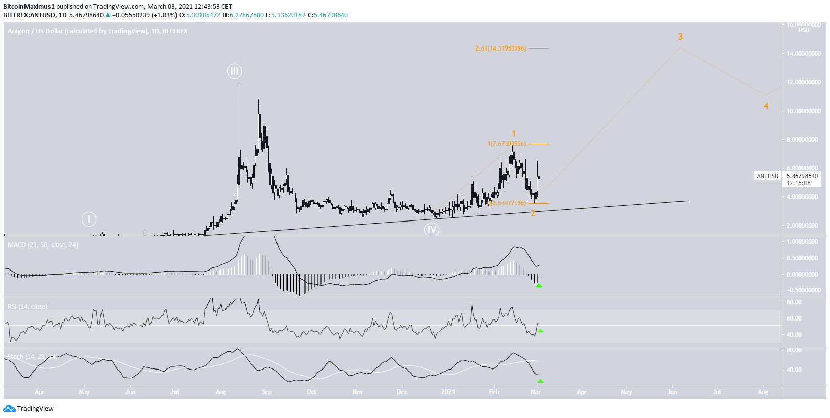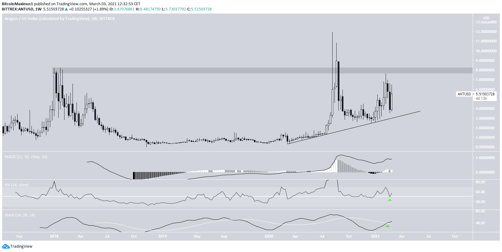 The Aragon (ANT) price has bounced above a long-term ascending support line and aims to reach the next resistance area at $8.