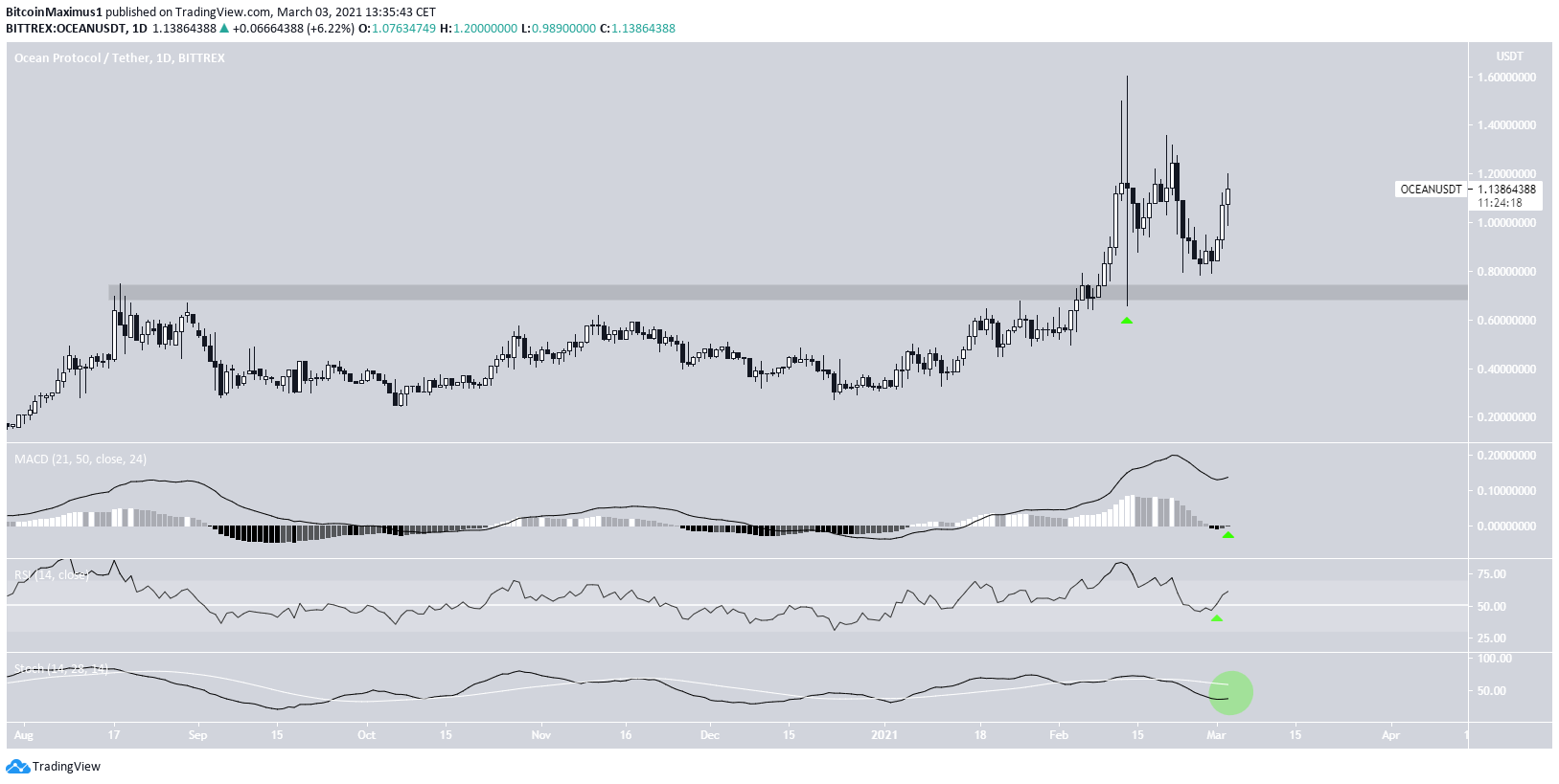 Both the MACD & RSI support the possibility of a breakout, which would likely take OCEAN towards the all-time high price of $1.60 and potentially higher.