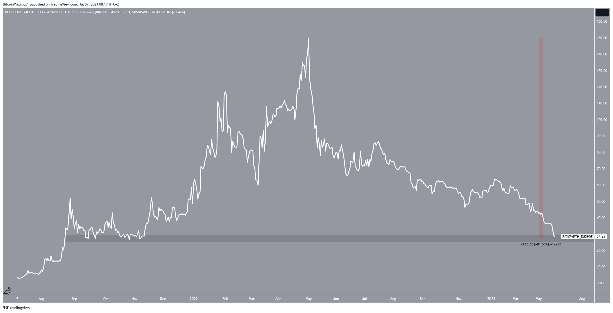 Since its nearly 150 ETH all-time high in March 2021, the BAYC floor price has fallen below 30, a decrease of 80%. This is the first time the floor has been below 30 since November 2021.Â