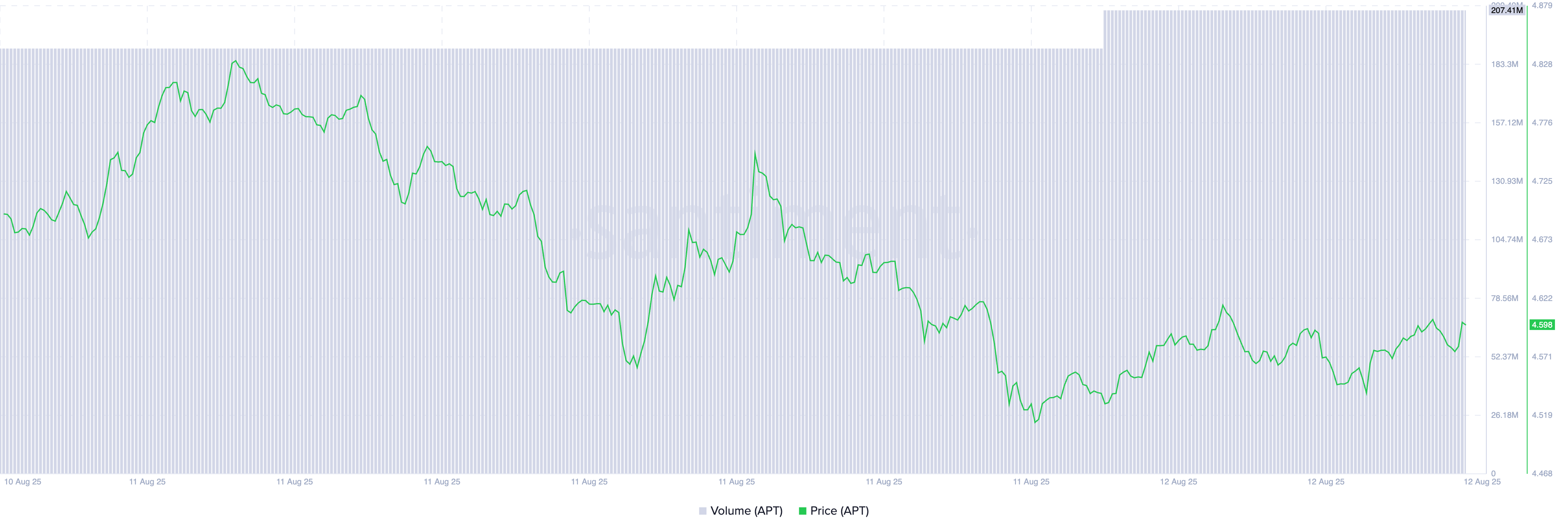 APT currently trades at $4.58, noting a 2% decline over the past 24 hours. During this same period, its trading volume has increased by 10%, indicating a rise in the number of coins changing hands.