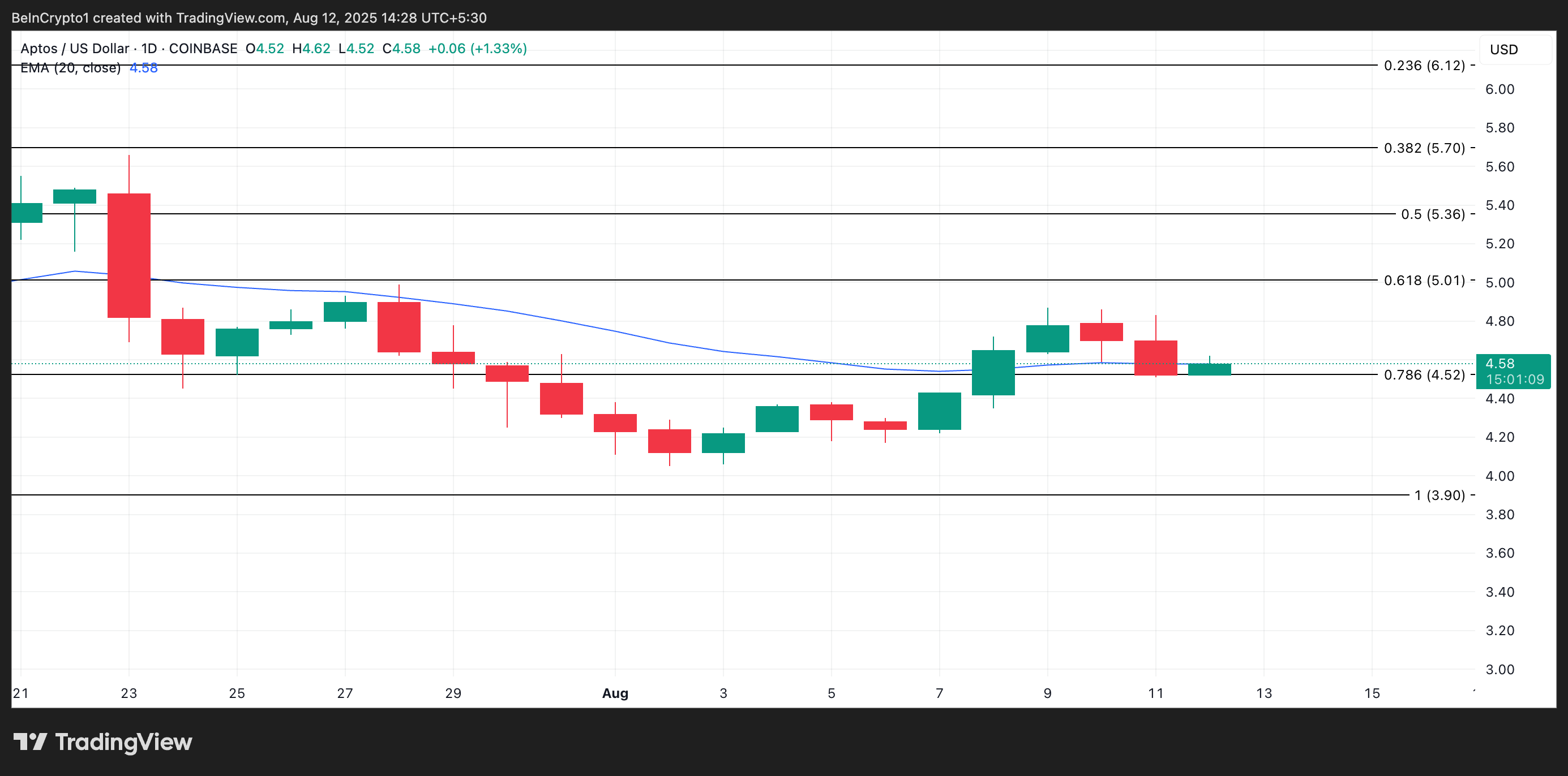 If APT’s price breaks decisively below the 20-day EMA, it would confirm that the bears have regained full market control. Such a move could trigger further selling pressure, pushing APT’s price down under $4.52.