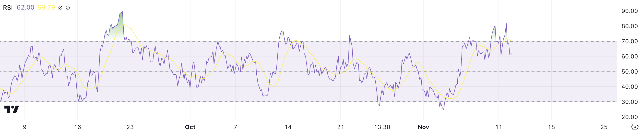 The RSI is a momentum indicator that ranges from 0 to 100. It is used to gauge whether an asset is overbought or oversold. Typically, values above 70 signal overbought conditions, while below 30 suggest oversold levels.
