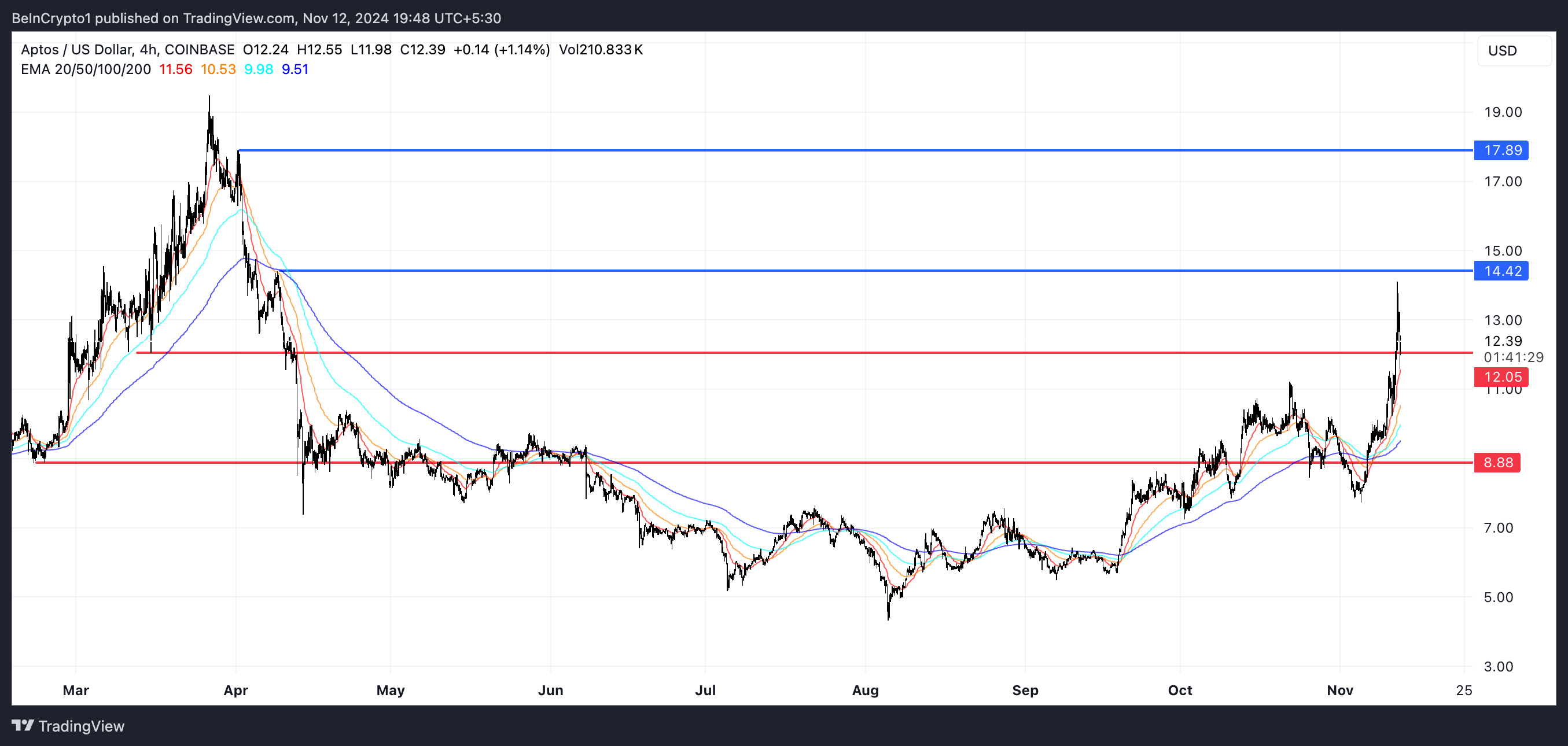 If this bullish momentum continues, APT could soon test the next significant resistance level at $14.42. A successful break above that could push the price even higher, potentially reaching $17.89, marking a 44% rise and the highest level since April.