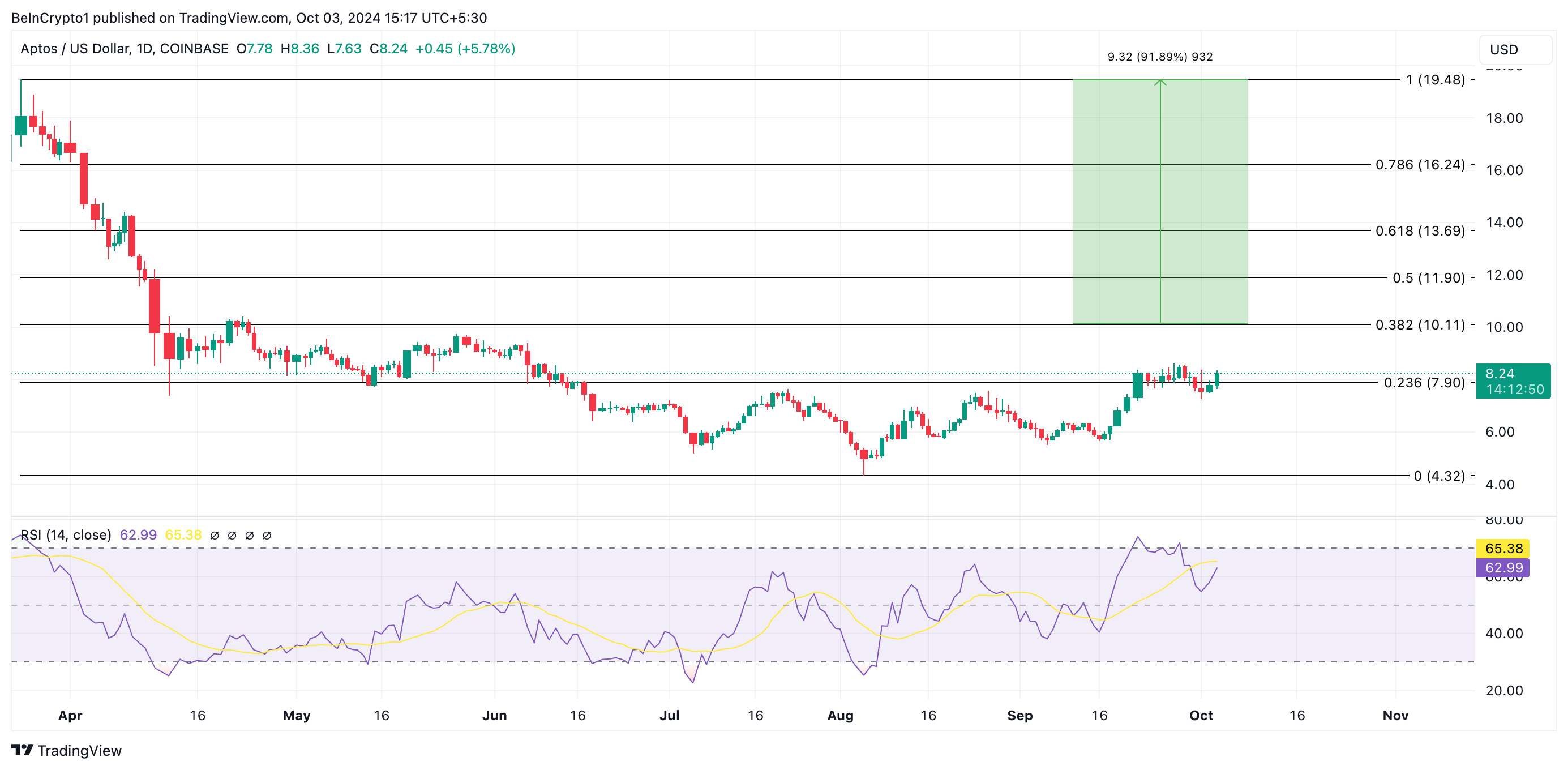 At 62.99, APT’s RSI suggests that buying momentum is high and outweighs profit-taking activity. According to the coin’s Fibonacci Retracement tool, if this trend continues, APT’s next target is $10.11, a high it last reached in April. If it breaches this crucial resistance level, it may chart its course toward $19.48.