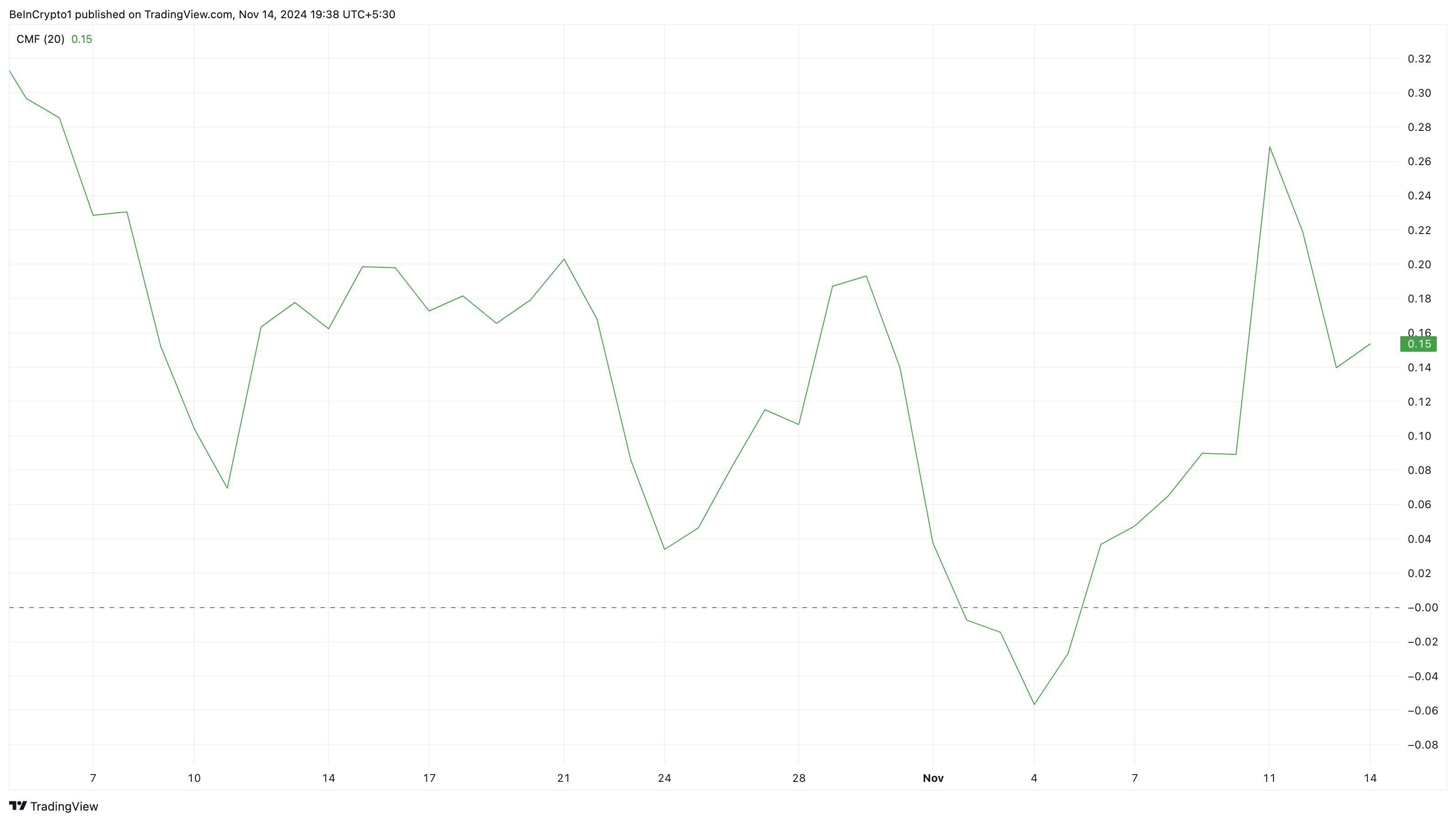 SponsoredFor context, the CMF is an indicator developed to track the accumulation and distribution of an asset over a specific period. It ranges from -1 to +1. When the reading rises, it means that accumulation is ongoing, and the price can increase.