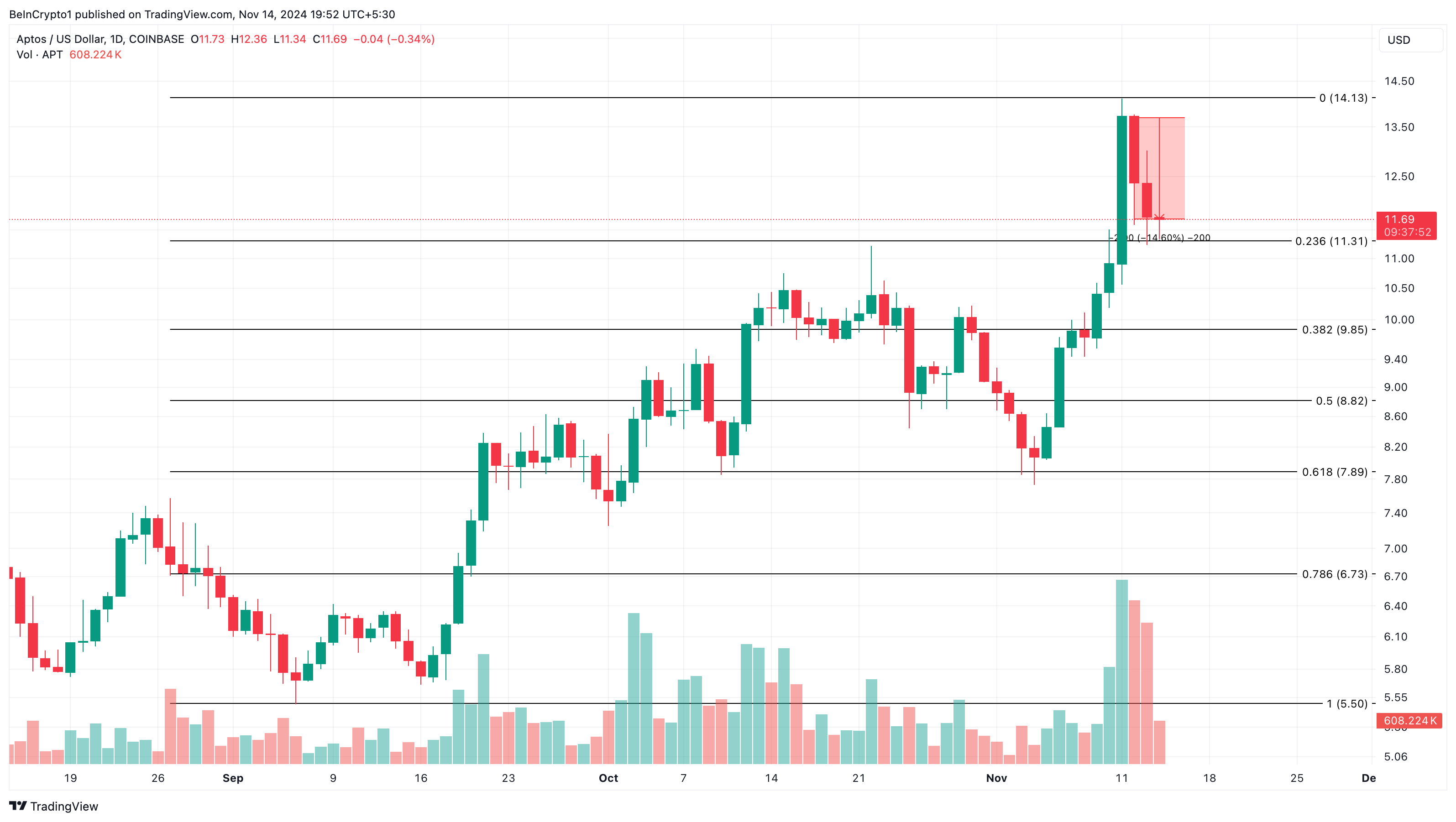 On the daily chart, Aptos faces resistance at $13.72, with support at $10.43, just below the 23.6% Fibonacci retracement level. Given the decline in trading volume, the price of Aptos could continue to slide, and bulls may struggle to maintain support at this level.