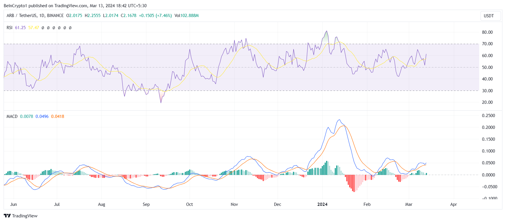 Arbitrum price trading at $2.16 is close to establishing a new all-time high. The former ATH of $2.42 was established at the beginning of this year, and ARB warrants an 11% rally to break through this. The chances of this happening are high for two reasons. The first is support from investors, and the second is market conditions.