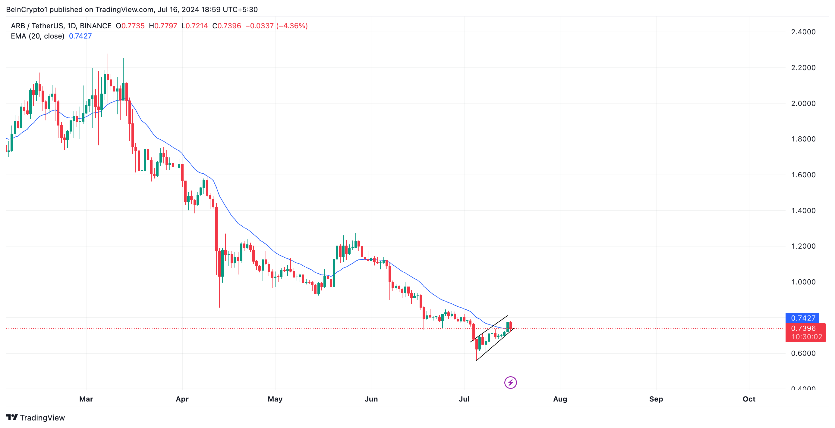 ARB has been trending within this channel since July 4, and its value has grown by 17%. During Monday’s trading session, the token successfully closed above its 20-day Exponential Moving Average (EMA) for the first time since June 5.