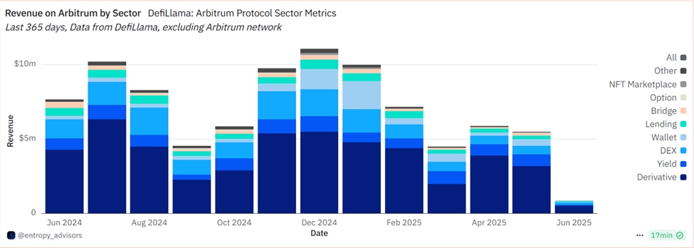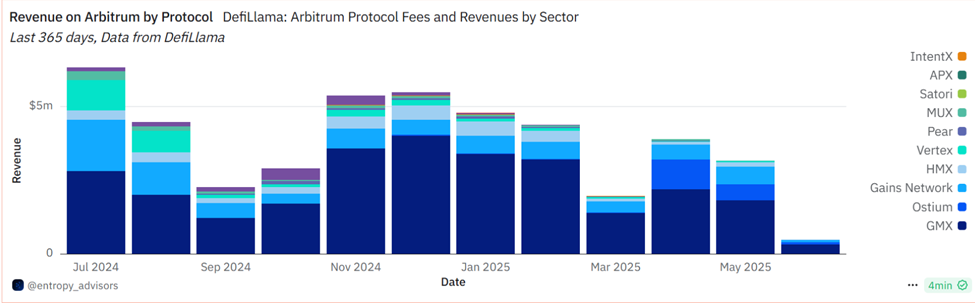 In May 2025, Arbitrum-based protocols collectively generated $5.5 million in revenue, a 6.54% month-over-month (MoM) drop.