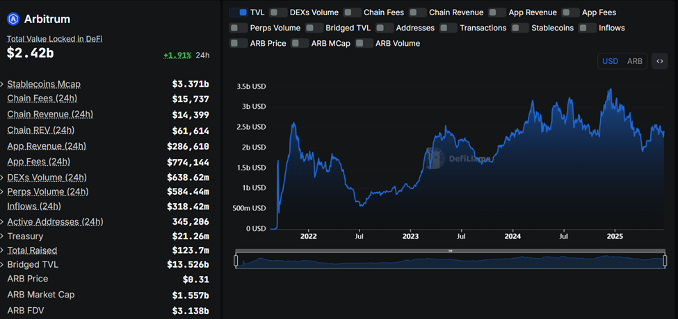 As of this writing, Arbitrum’s total value locked (TVL) sits at $2.42 billion, according to DefiLlama. A key driver of this growth is real-world assets.
