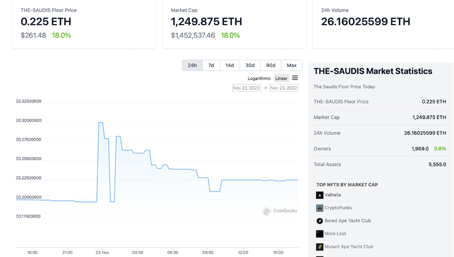 While one team lost and tanked, Saudi Arabia’s national team and fans rejoiced in their unexpected victory. The floor price of ‘The Saudis,’ a Saudi Arabian-themed nonfungible token (NFT) collection (unofficial), spiked by more than 50%.