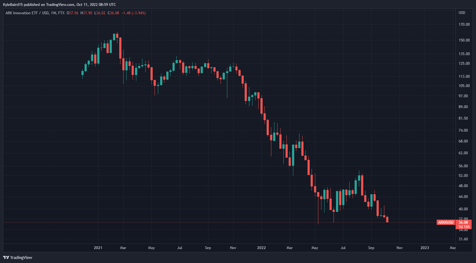 Sponsored SponsoredThe innovation-focused investment firm recorded at press time that its ARK Innovation ETF is maintaining a Net Asset Value of $36.32 with a negative YTD (yield to date) of 55.72%.