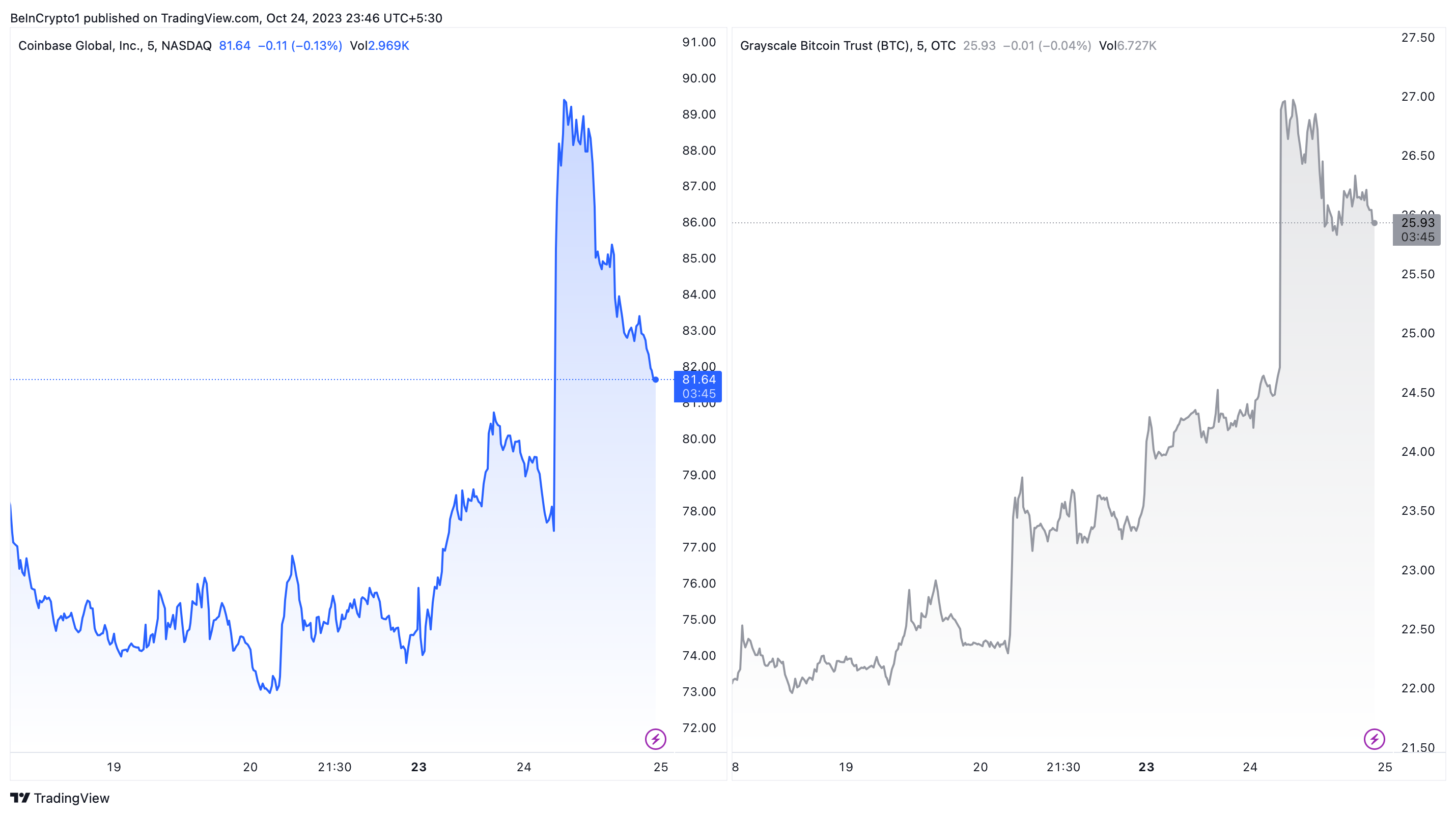 For instance, Coinbase and Grayscale Bitcoin Trust are among the beneficiaries, witnessing a substantial uptick in their share prices. COIN soared by 16% to around $89, and GBTC saw a 10% uptick in its shares, reaching $27.