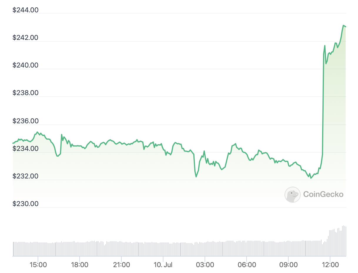 Shortly after the ARKM launch announcement, buying pressure for BNB spiked the coin’s price 3.6% to $243.